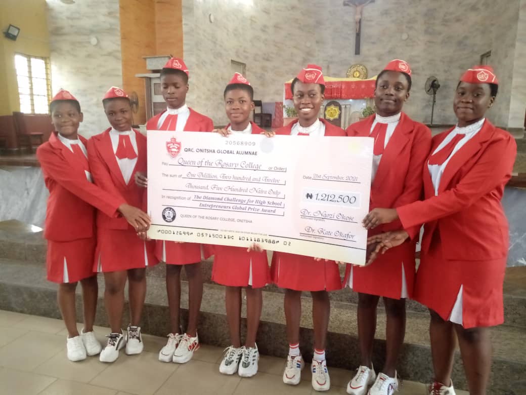 The Queen of the Rosary College, Onitsha Global Alumnae Association (Old Girls) led by Dr. (Mrs.) Ngozi Okose, USA (Global President, QRC Alumnae Association) last Tuesday at the College’s Chapel presented a Cheque of One Million Two Hundred and Twelve Thousand Five Hundred Naira (1,212,500) to the seven winners of the Diamond Challenge for High School Entrepreneurs, conducted by the University of Delaware in the USA.