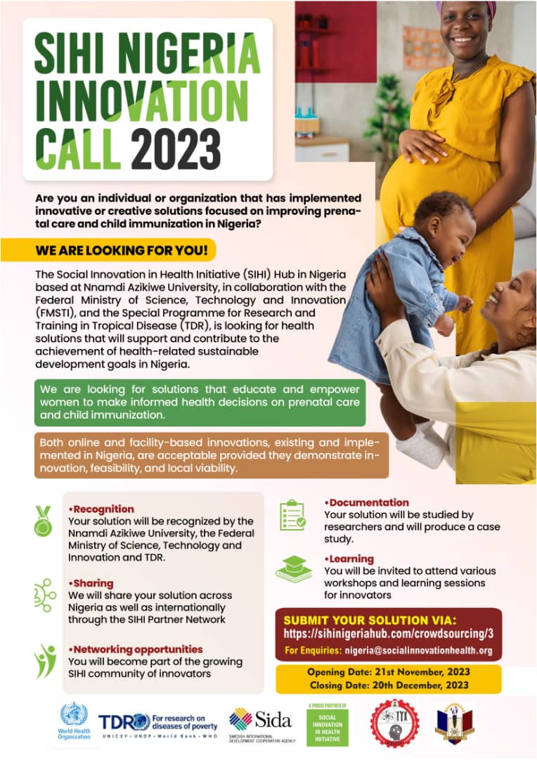 The programme, which will close on 20th December, 2023, is powered by Social Innovation in Health Initiative (SIHI) Nigeria Hub in partnership with the Federal Ministry of Science, Technology and Innovation (FMSTI) and the Special Programme for Research and Training in Tropical Diseases (TDR).